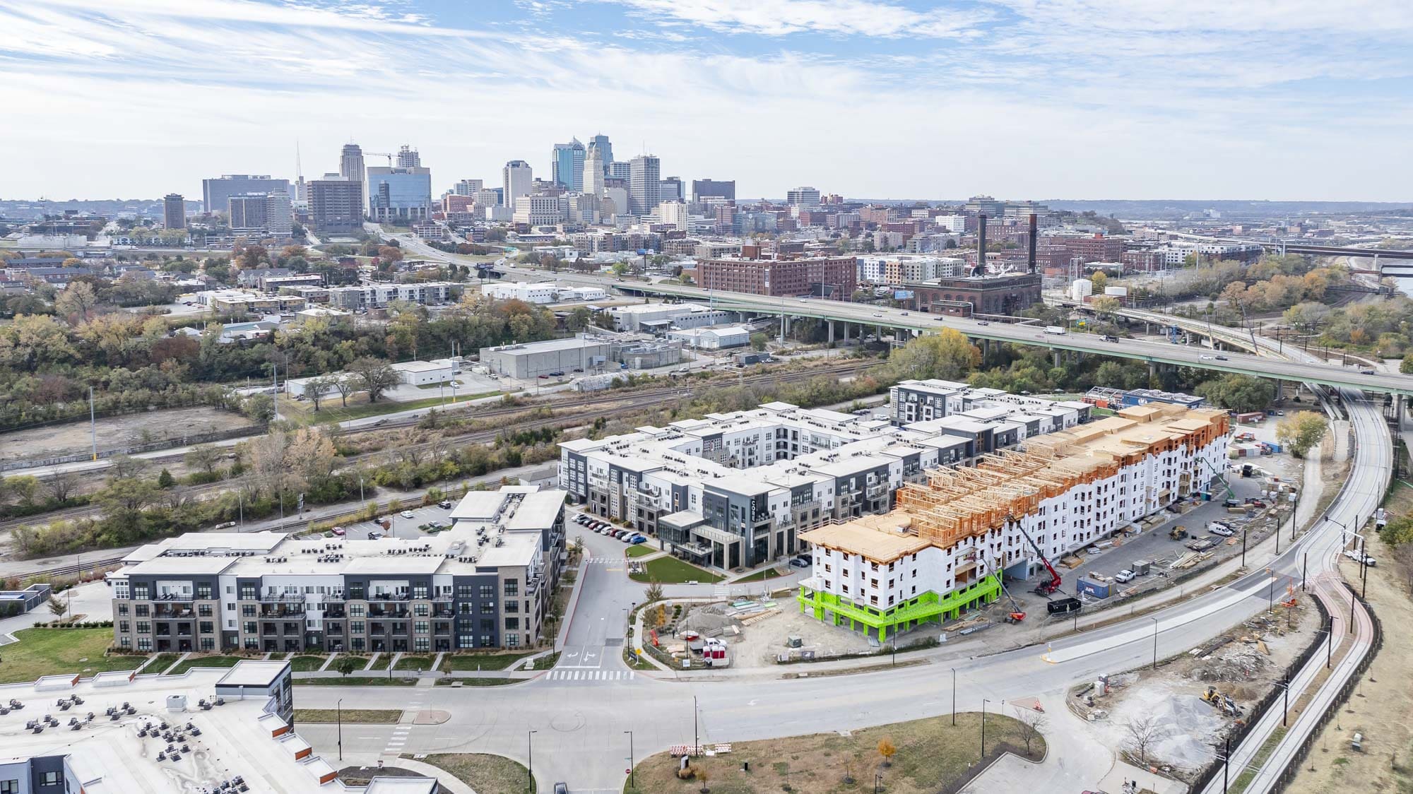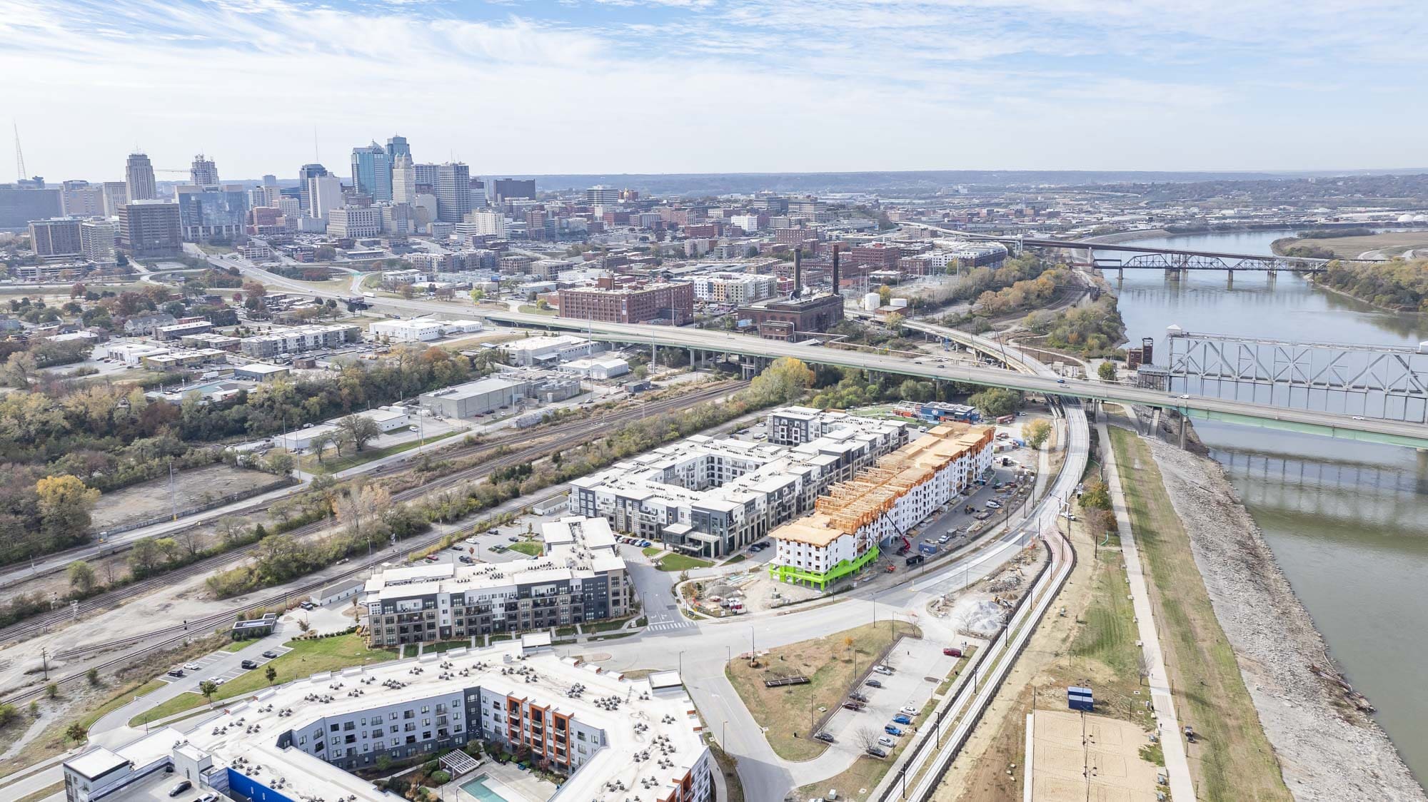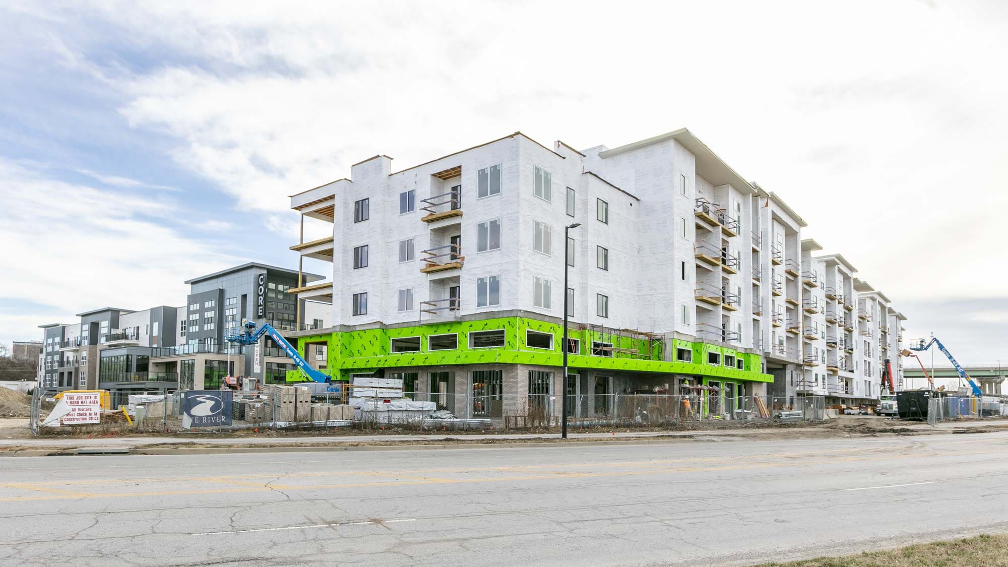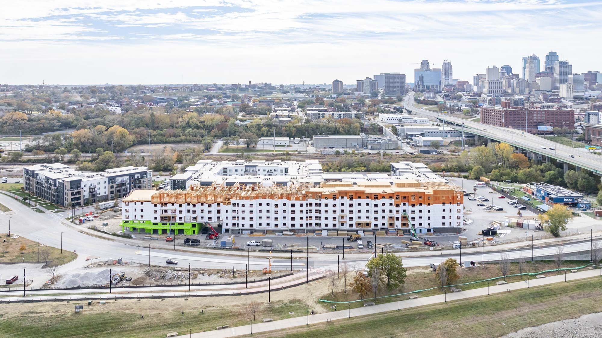 The West portion of the building houses a 77-space parking garage under a podium deck, while the East side features a 2-story Clubhouse and retail space under a separate podium deck. The 2nd through 6th floors consist of (153) wood-framed luxury units built using Type III construction. Given the soils challenges presented by the building’s proximity to the Missouri River, the building is supported on 40-foot deep rigid inclusions.