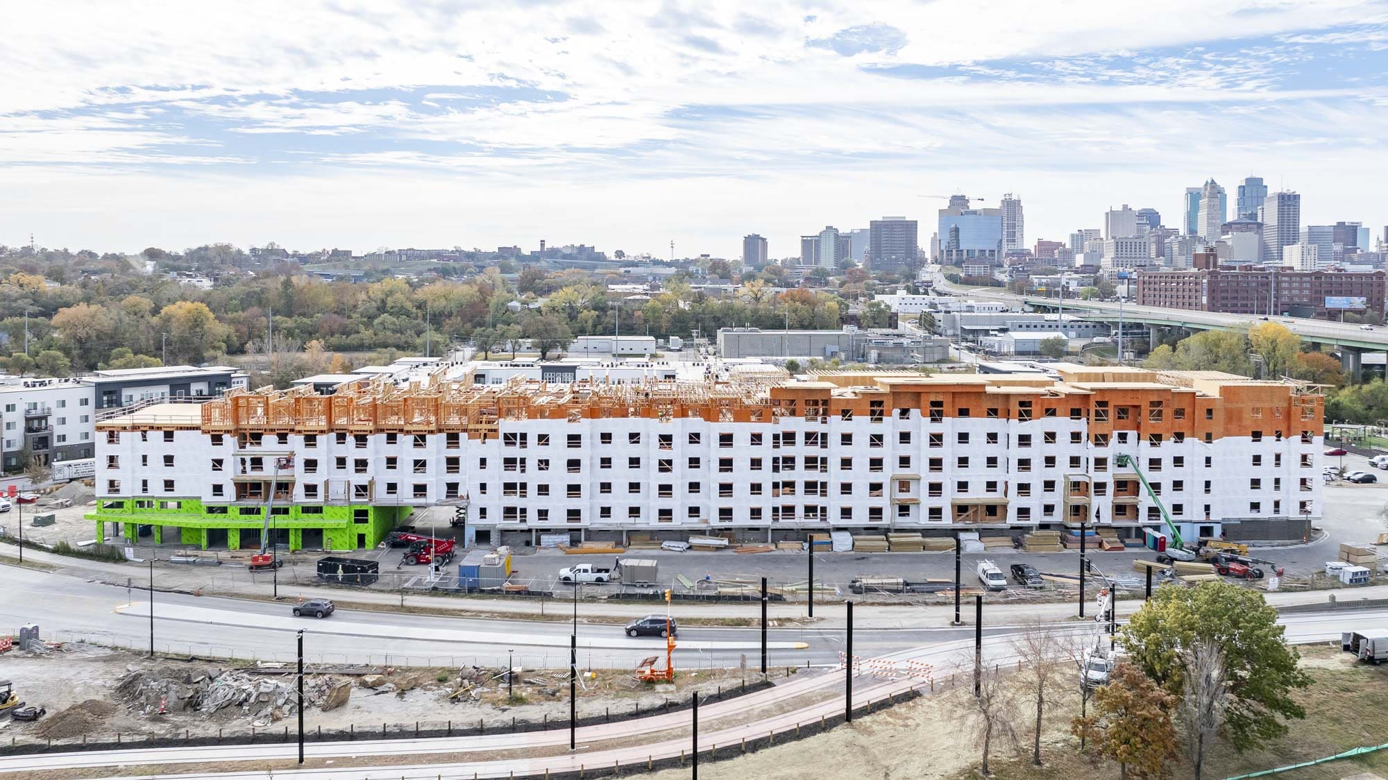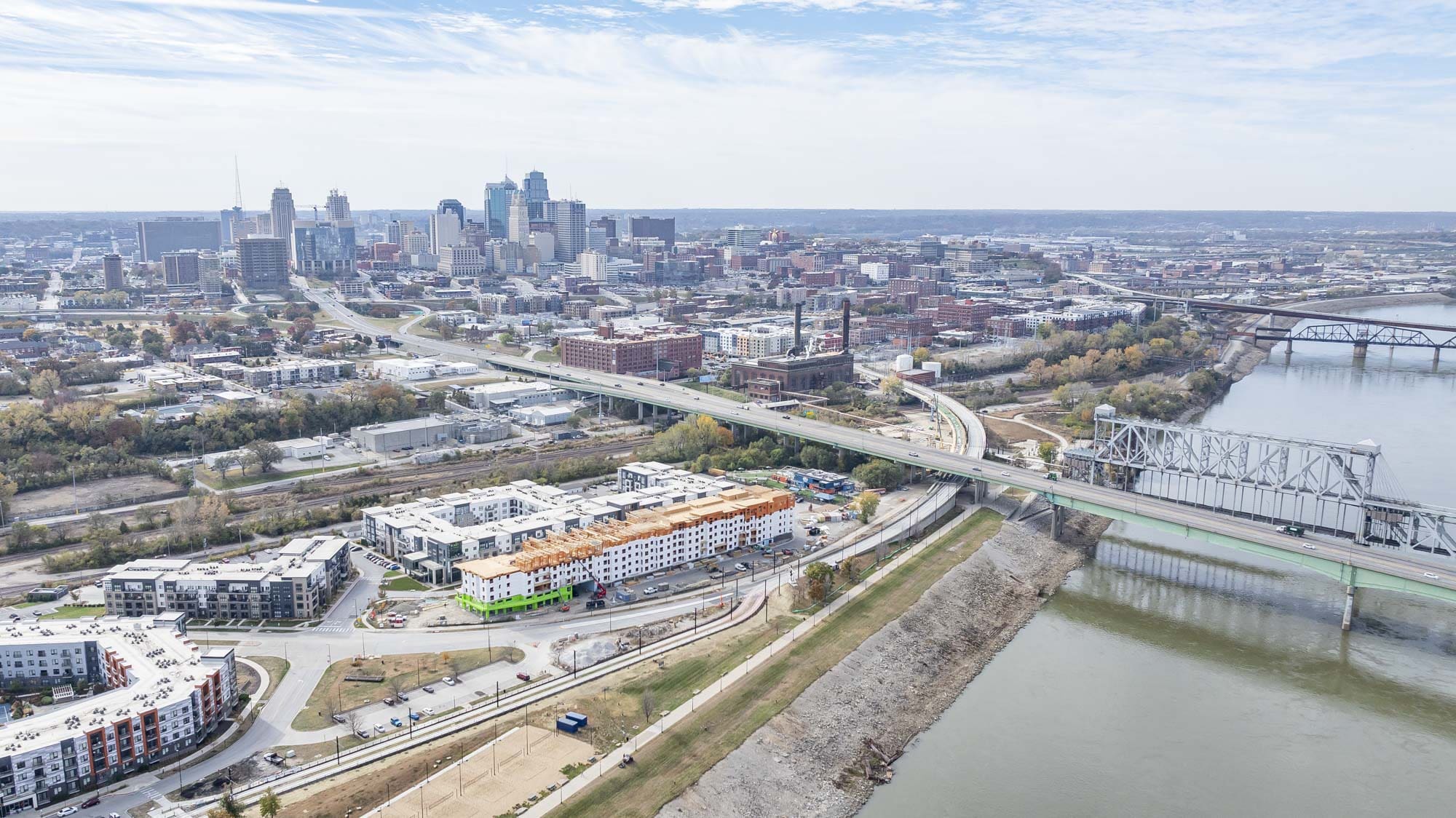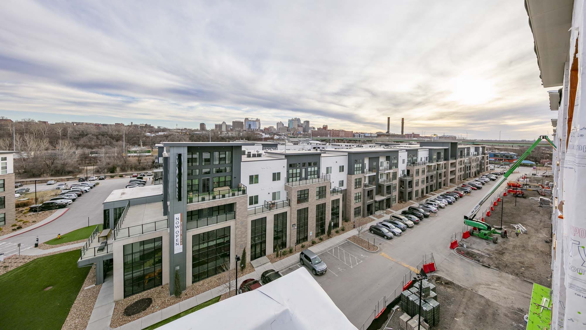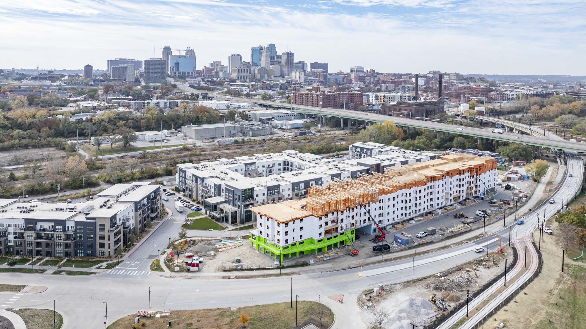 The West portion of the building houses a 77-space parking garage under a podium deck, while the East side features a 2-story Clubhouse and retail space under a separate podium deck. The 2nd through 6th floors consist of (153) wood-framed luxury units built using Type III construction. Given the soils challenges presented by the building’s proximity to the Missouri River, the building is supported on 40-foot deep rigid inclusions.
