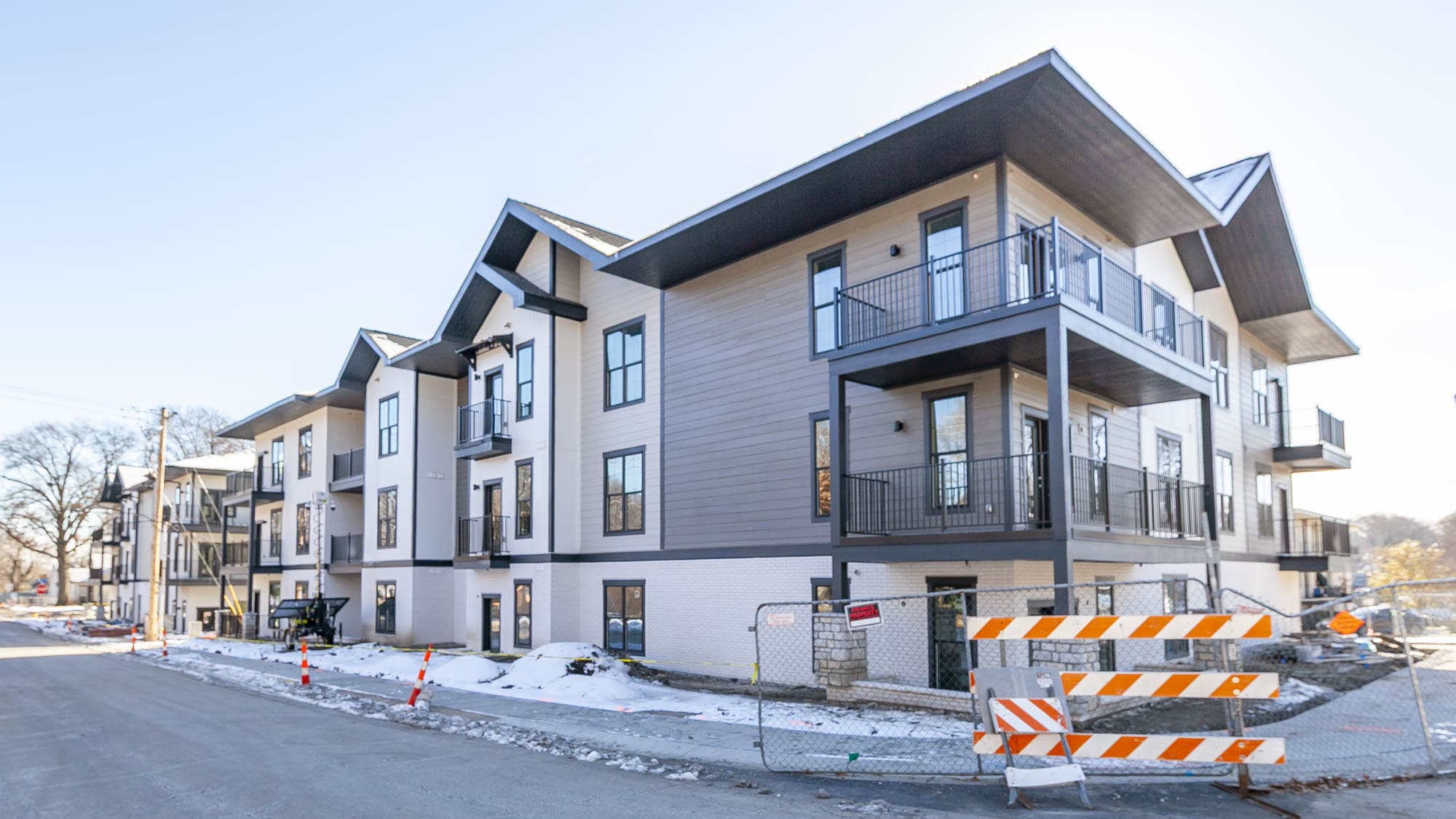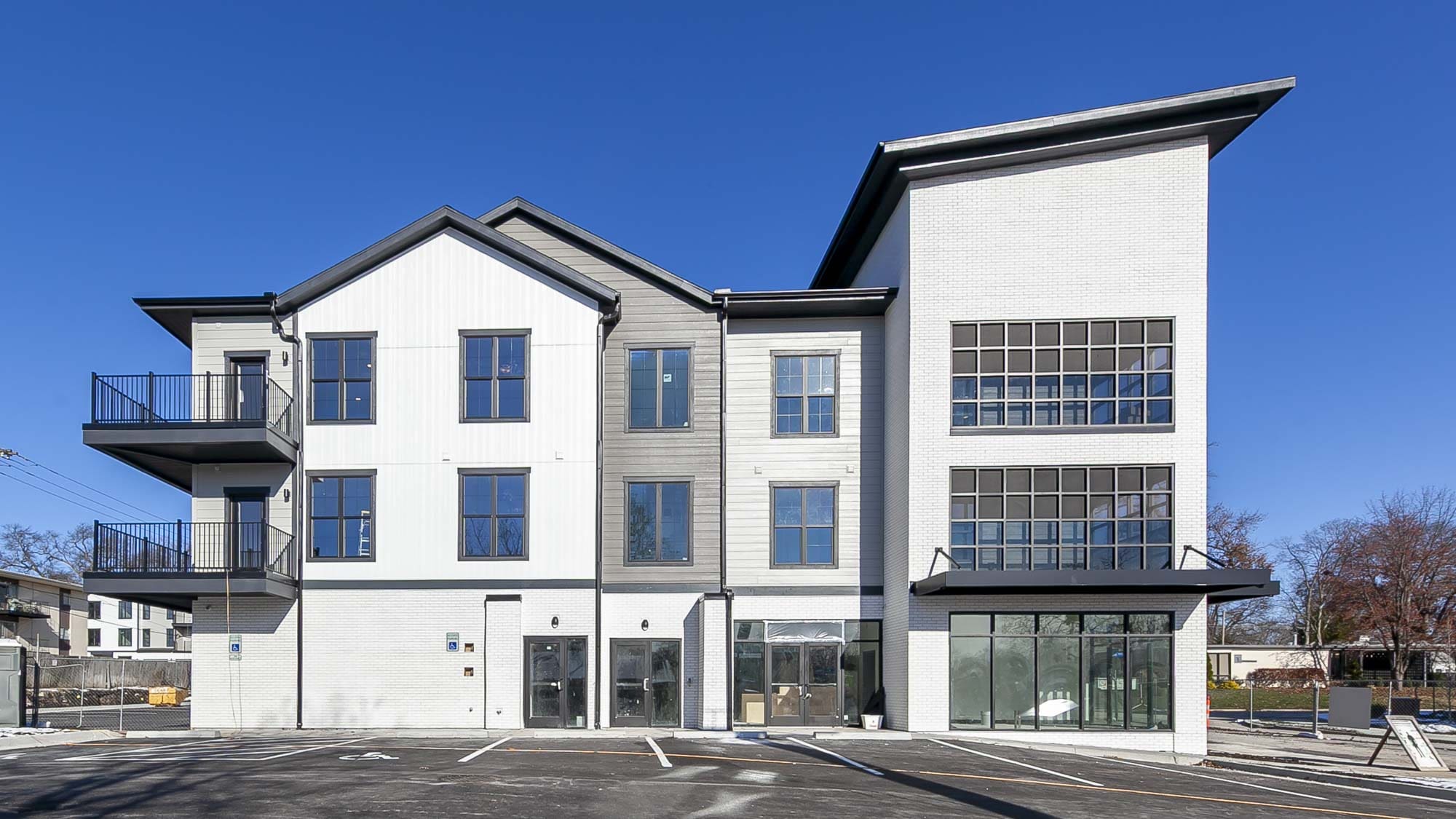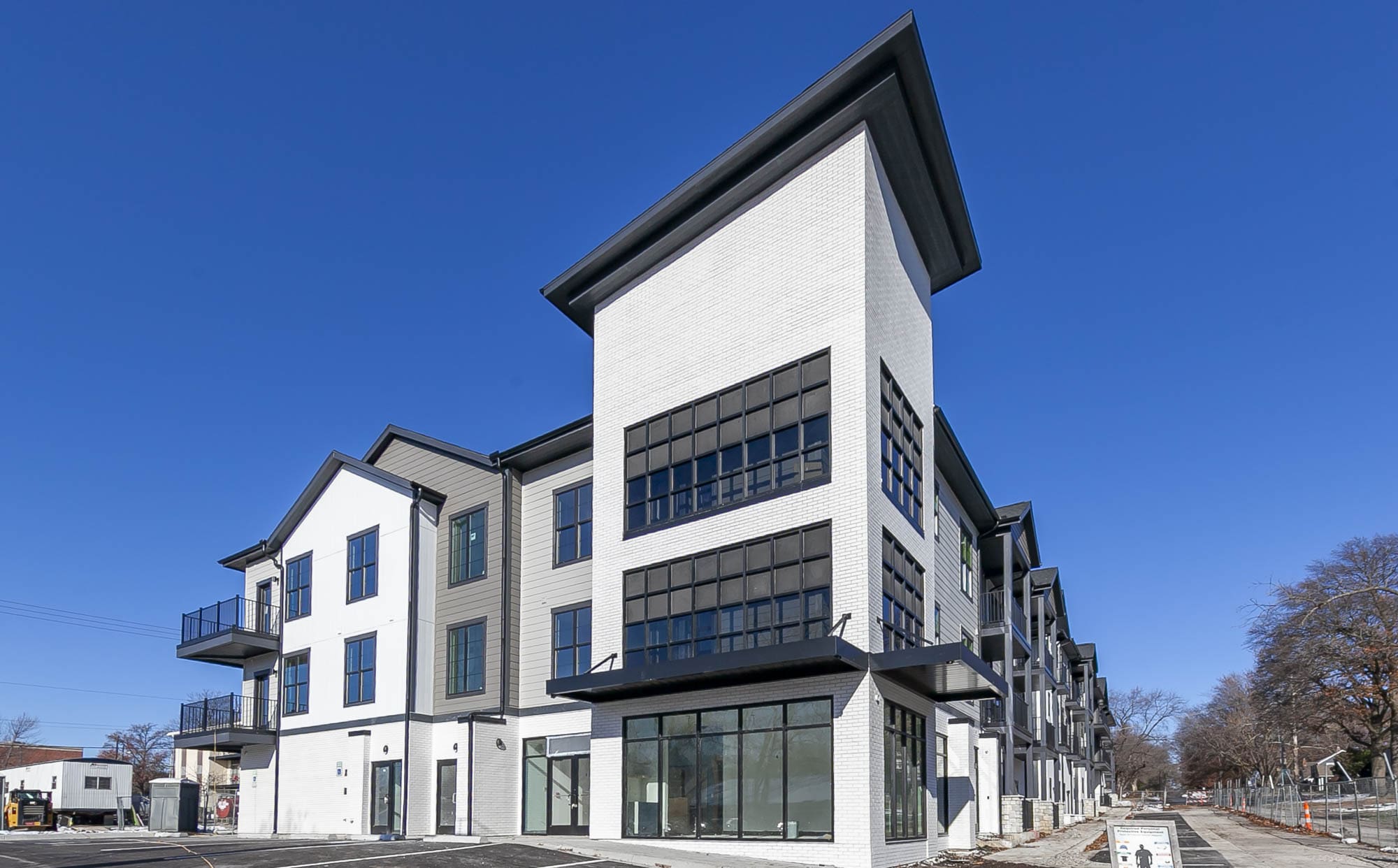 Designed by Klover Architects, the exterior cladding features thin brick with cementitious siding. Unit interior finishes include granite countertops, white shaker style cabinets, stainless appliances, tiled backsplashes and showers, luxury vinyl plank flooring, carpeted bedrooms, plus modern lighting and hardware.
