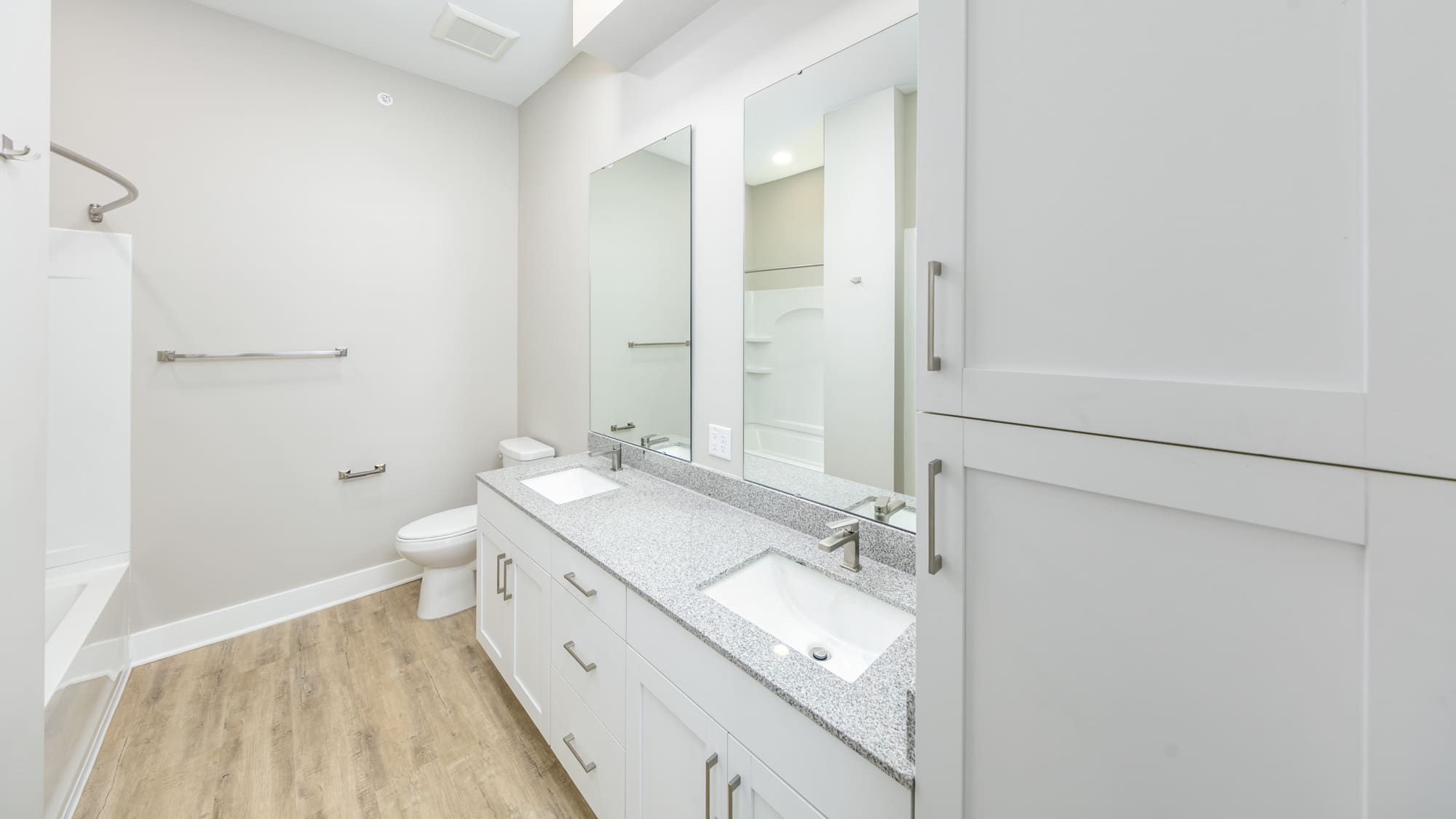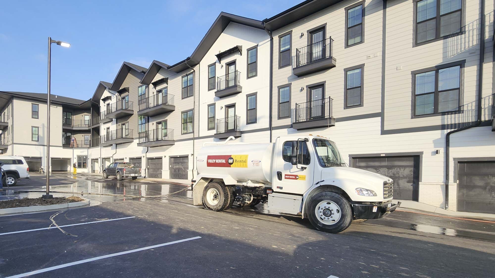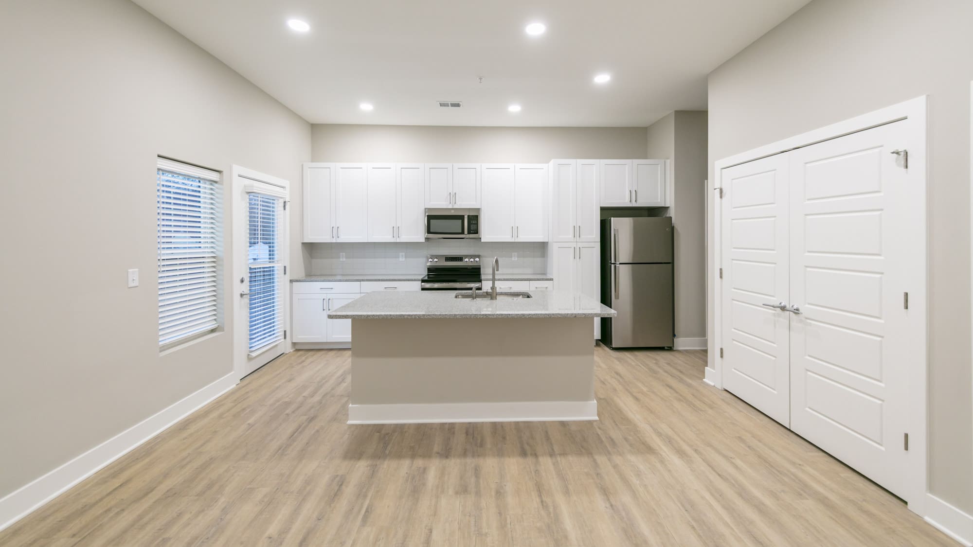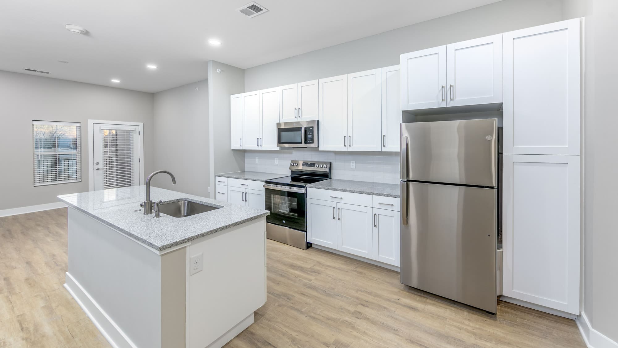 Designed by Klover Architects, the exterior cladding features thin brick with cementitious siding. Unit interior finishes include granite countertops, white shaker style cabinets, stainless appliances, tiled backsplashes and showers, luxury vinyl plank flooring, carpeted bedrooms, plus modern lighting and hardware.